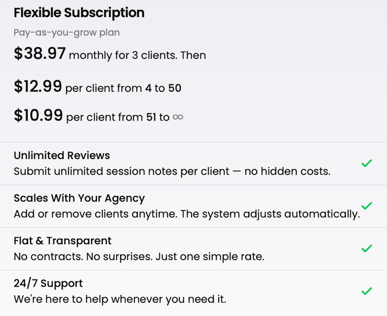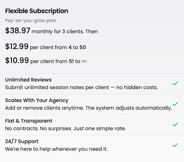 Only pay for what you use. Transparent, flexible, and designed for growing ABA agencies.
